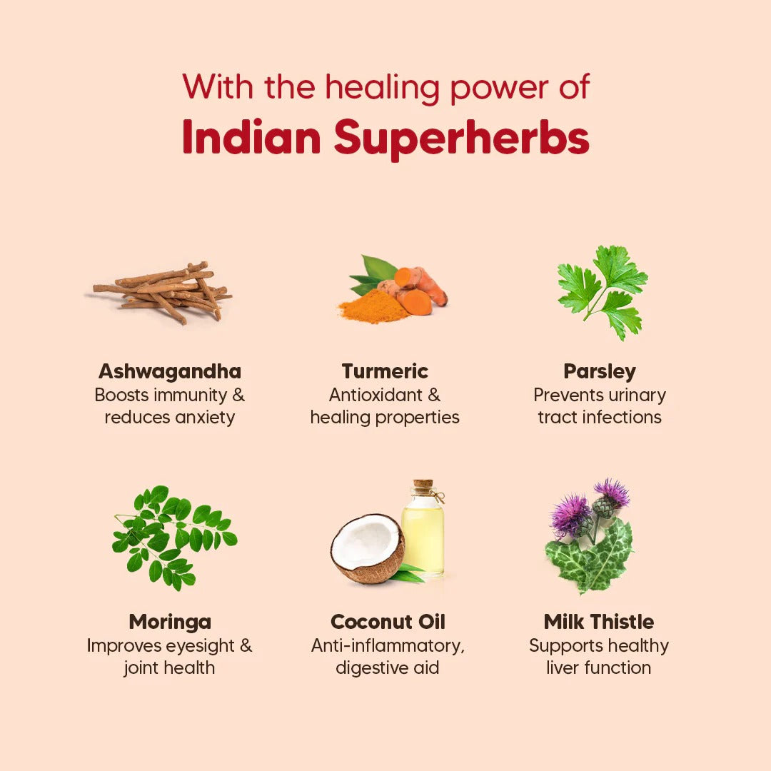 Additionally, we sprinkle more love and age-old, trusted Indian herbs and superfoods into the mix! The healing properties of Ashwagandha, Moringa, Turmeric, Milk Thistle, Parsley and Coconut Oil are the finishing touches to a recipe that we made with all our heart, for complete nutrition.