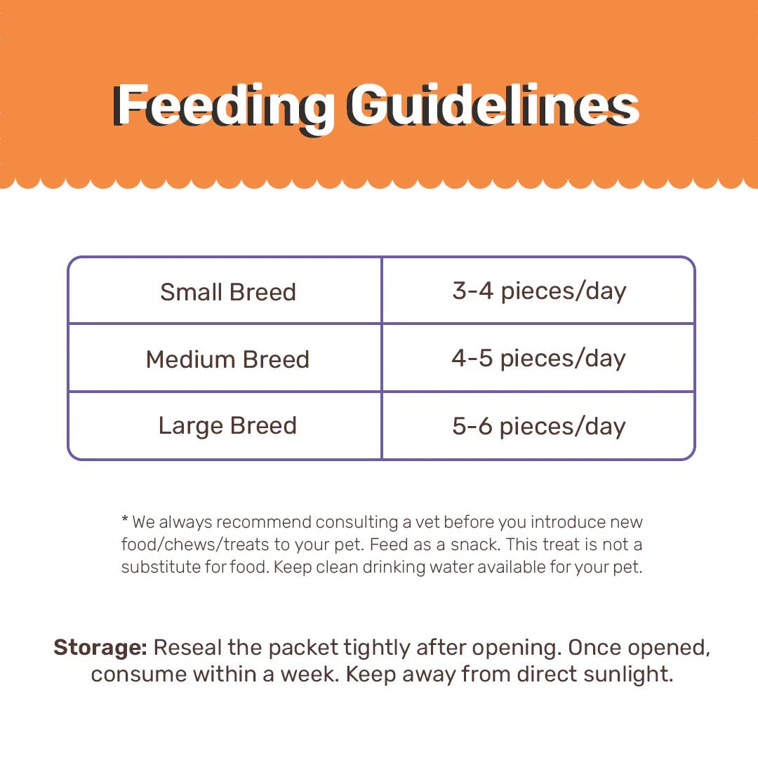 These soft chew treats will be well enjoyed by dogs of all ages & breeds- but are particularly an ideal choice for teething puppies, dogs with sensitive teeth or senior dogs who have difficulty chewing.
