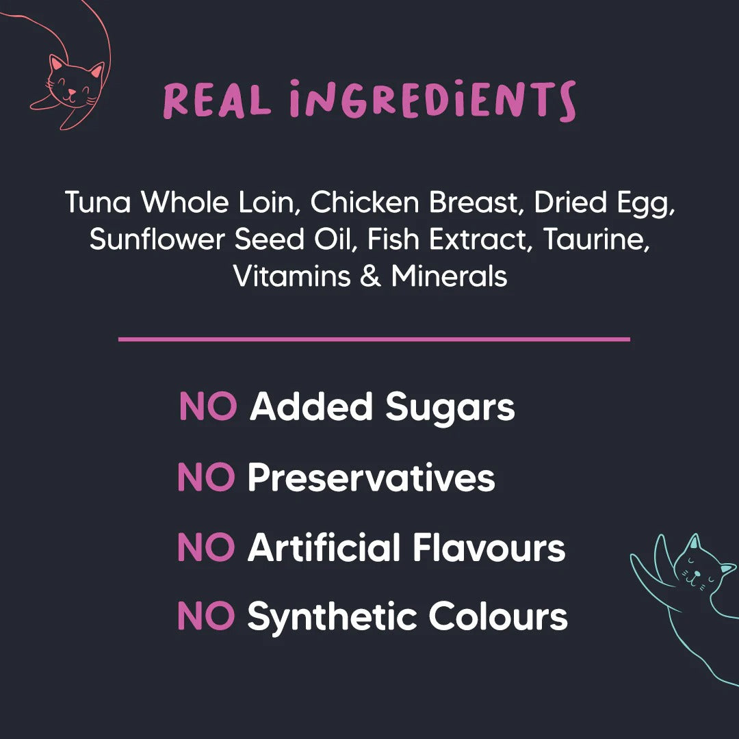 - Real ingredients: Tuna Whole Loin, Chicken Breast, Dried Egg, Sunflower Seed Oil, Fish Extract, Taurine, Vitamins & Minerals.