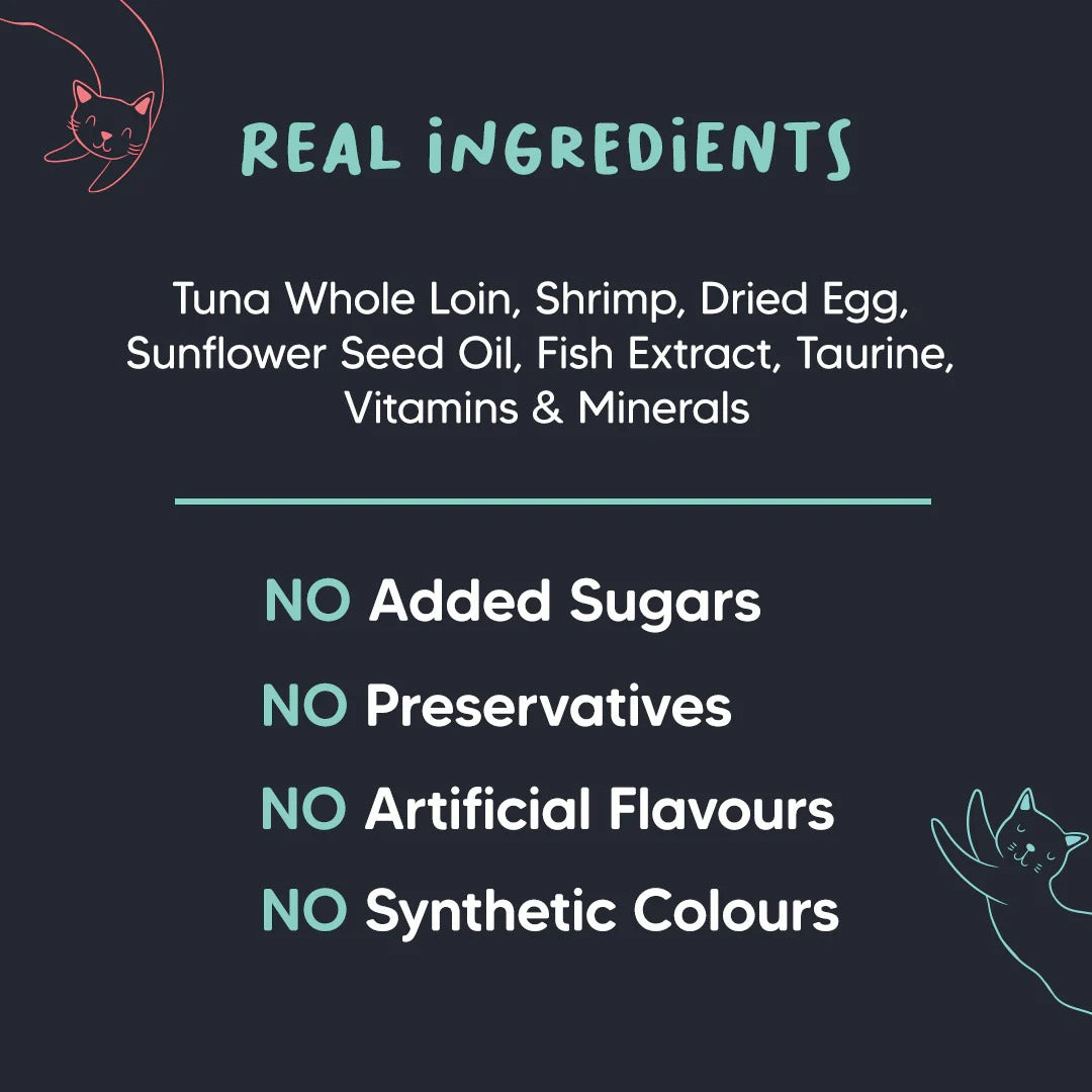 - Real ingredients: Tuna Whole Loin, Shrimp, Dried Egg, Sunflower Seed Oil, Fish Extract, Taurine, Vitamins & Minerals.